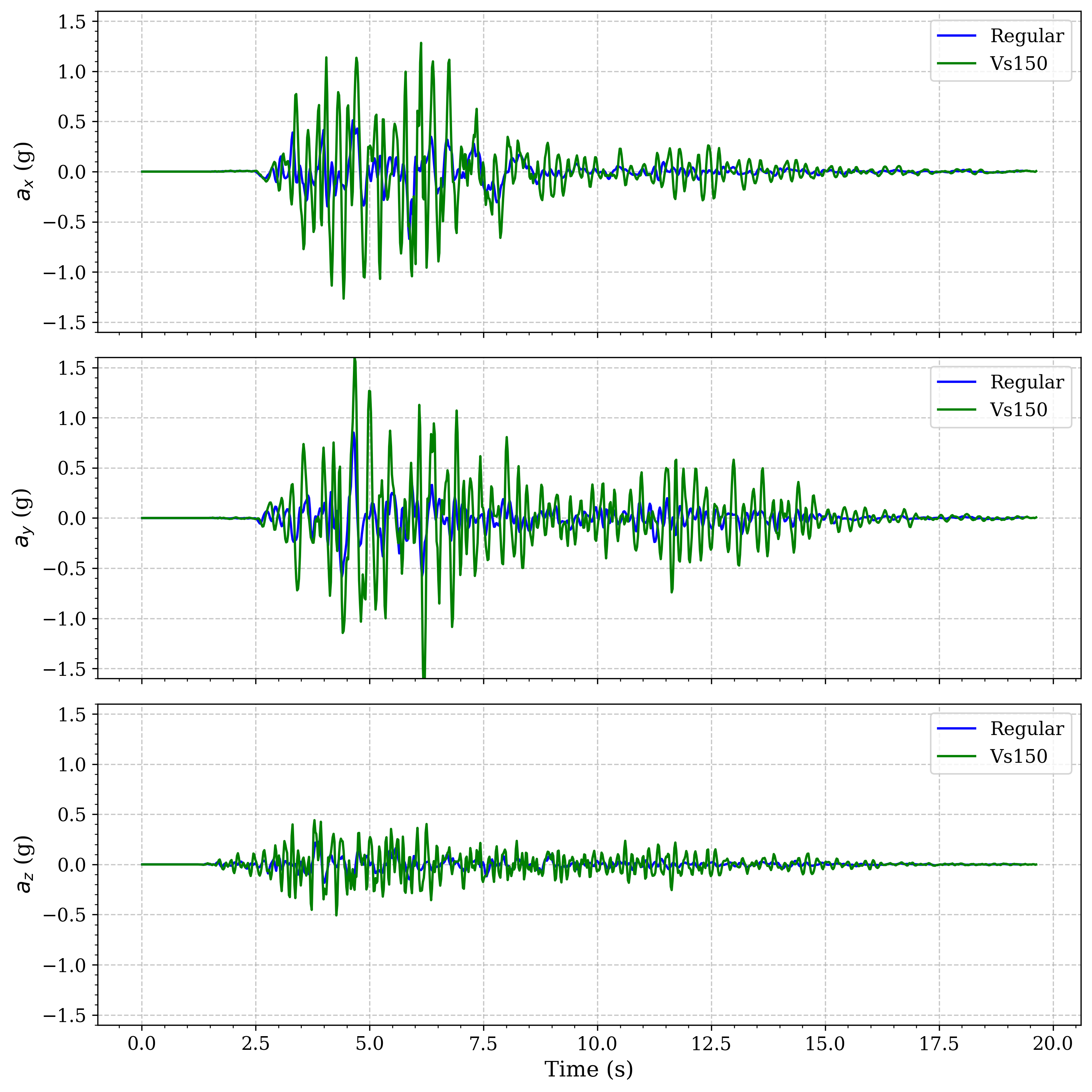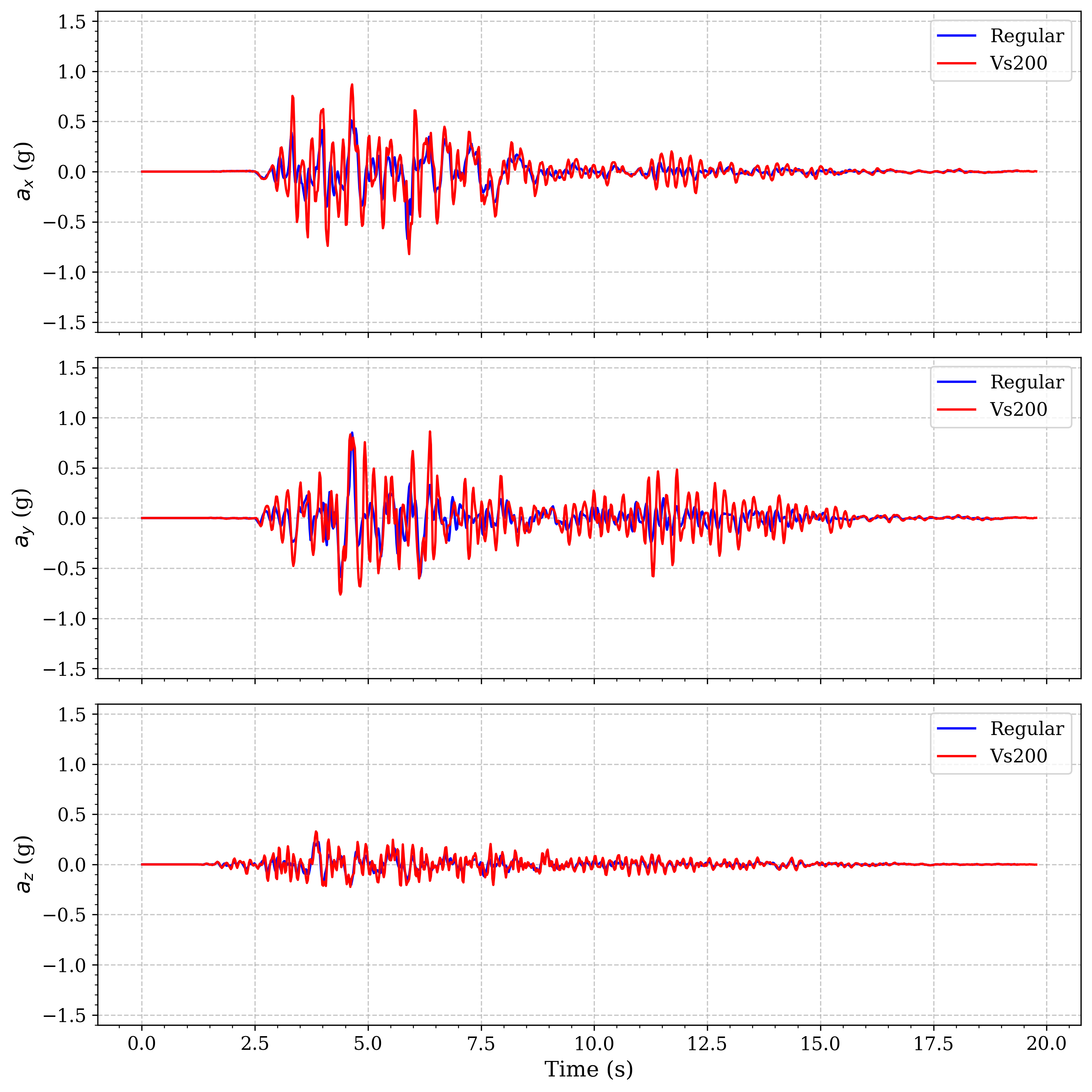 The following figures compare the surface acceleration time histories for three cases: - Regular layered soil (no basin) - Basin with Vs = 200 m/s (stiffer soft soil) - Basin with Vs = 150 m/s (softer soil)