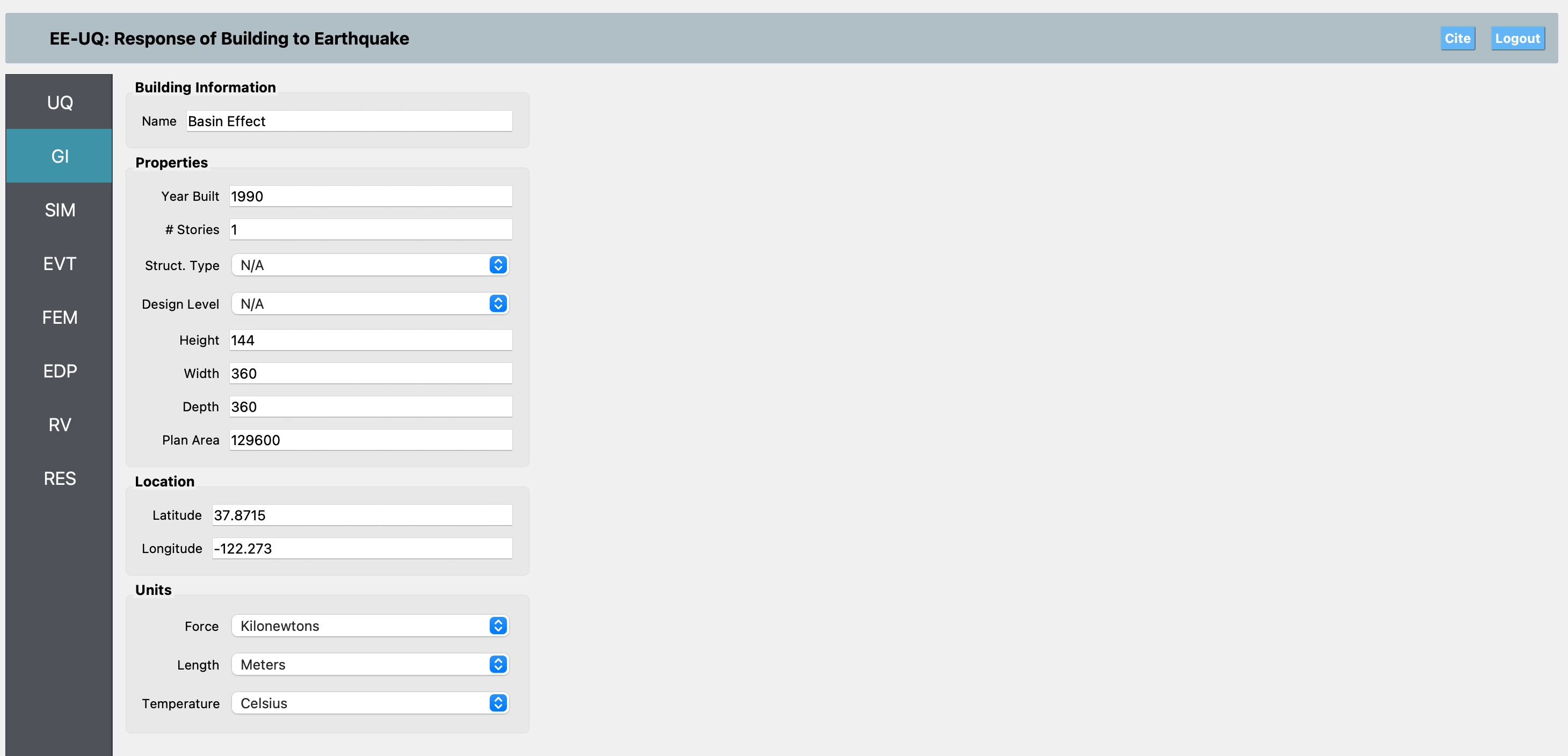 GI Panel: Enter general information about the project and model. For this example, set the Structure Type and Design Level fields to N/A since there is no structure being modeled. For the units, use kilonewtons (kN) for force, meters (m) for length, and seconds (s) for time.