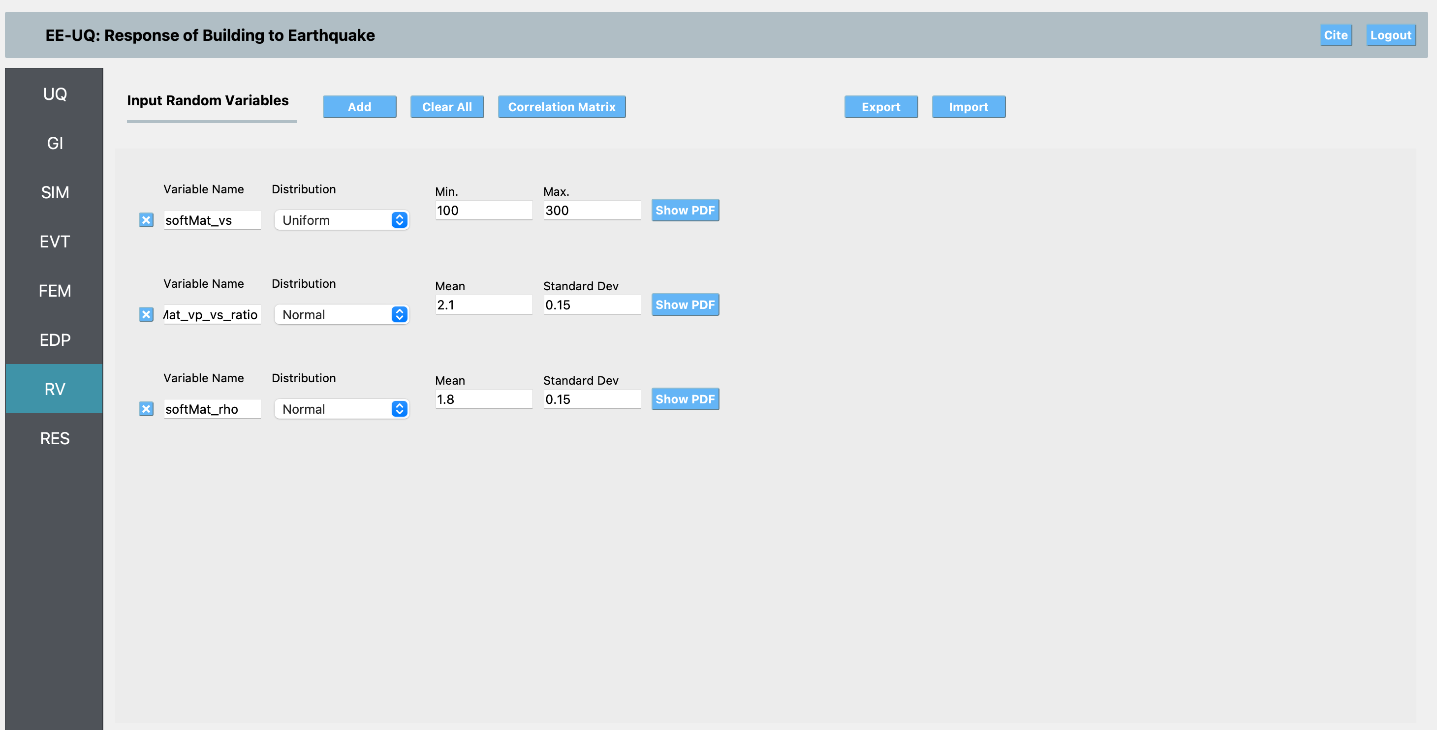 RV Panel: Define any random variables for the study (e.g., material properties, input motion scaling).