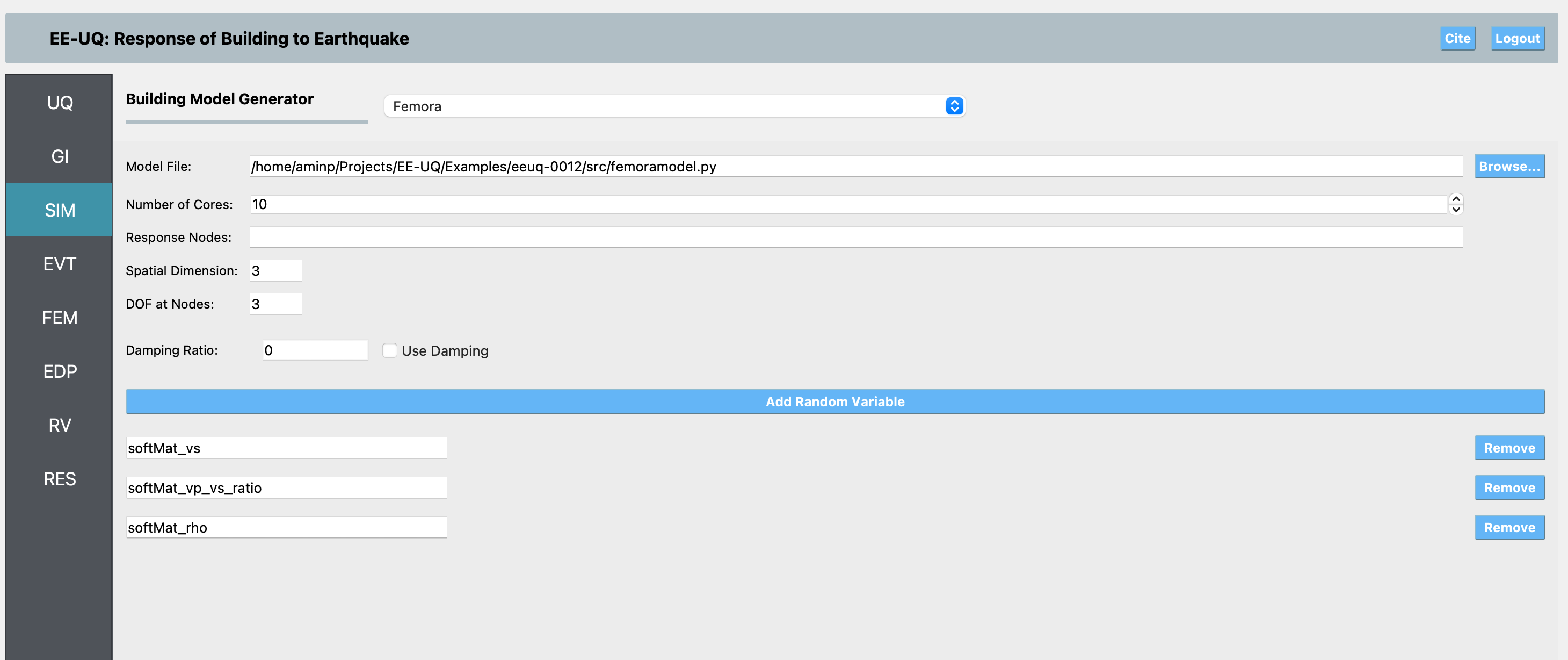 In the Femora SIM panel, you also need to add any random variables you want to use in your Femora model. These random variables should be referenced in your Femora script, but you do not need to define their values in your code. EE-UQ will automatically provide the appropriate values for each simulation sample. This allows you to easily perform uncertainty quantification by sampling different values for these variables across multiple runs.