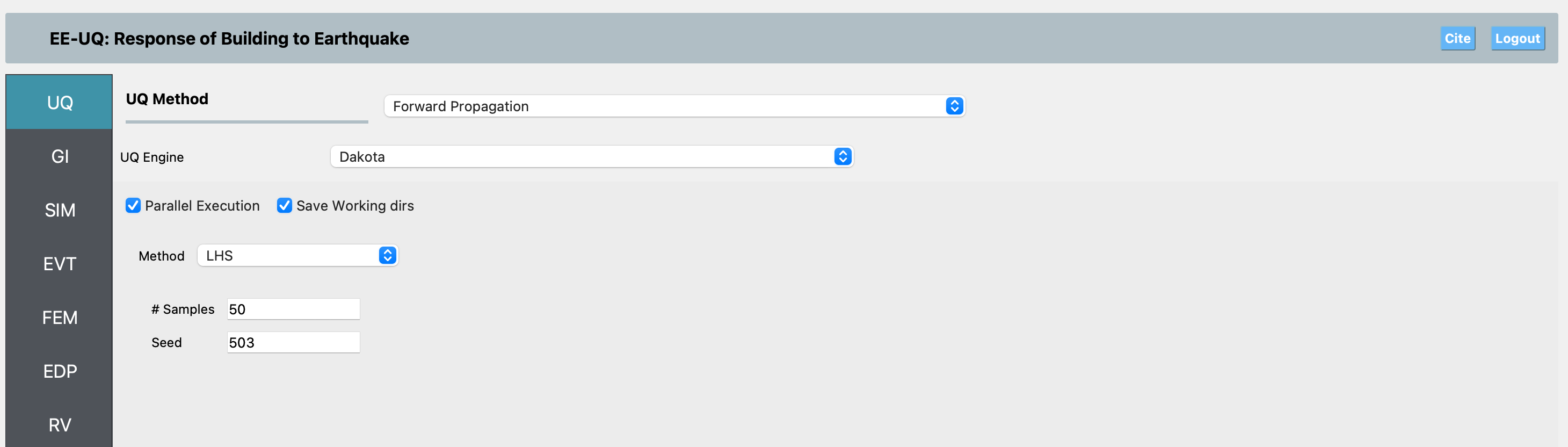 UQ Panel: Select the UQ engine and method (e.g., Forward Propagation with Dakota). Set the number of samples as needed.