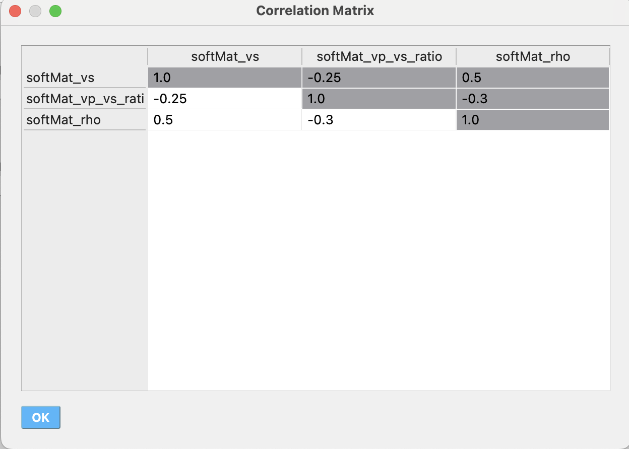This matrix encodes the assumed statistical relationships between the random variables. For example, a negative correlation between softMat_vs and softMat_vp_vs_ratio (-0.25) means that higher shear wave velocities are likely to be associated with slightly lower vp/vs ratios, and vice versa. The positive correlation (0.5) between softMat_vs and softMat_rho reflects that denser soils tend to have higher wave velocities. The negative correlation (-0.3) between softMat_vp_vs_ratio and softMat_rho reflects that, for a given vs, a higher vp/vs ratio may be associated with slightly lower density. These values are chosen to reflect plausible physical relationships and to avoid unrealistic combinations of properties in the UQ study.