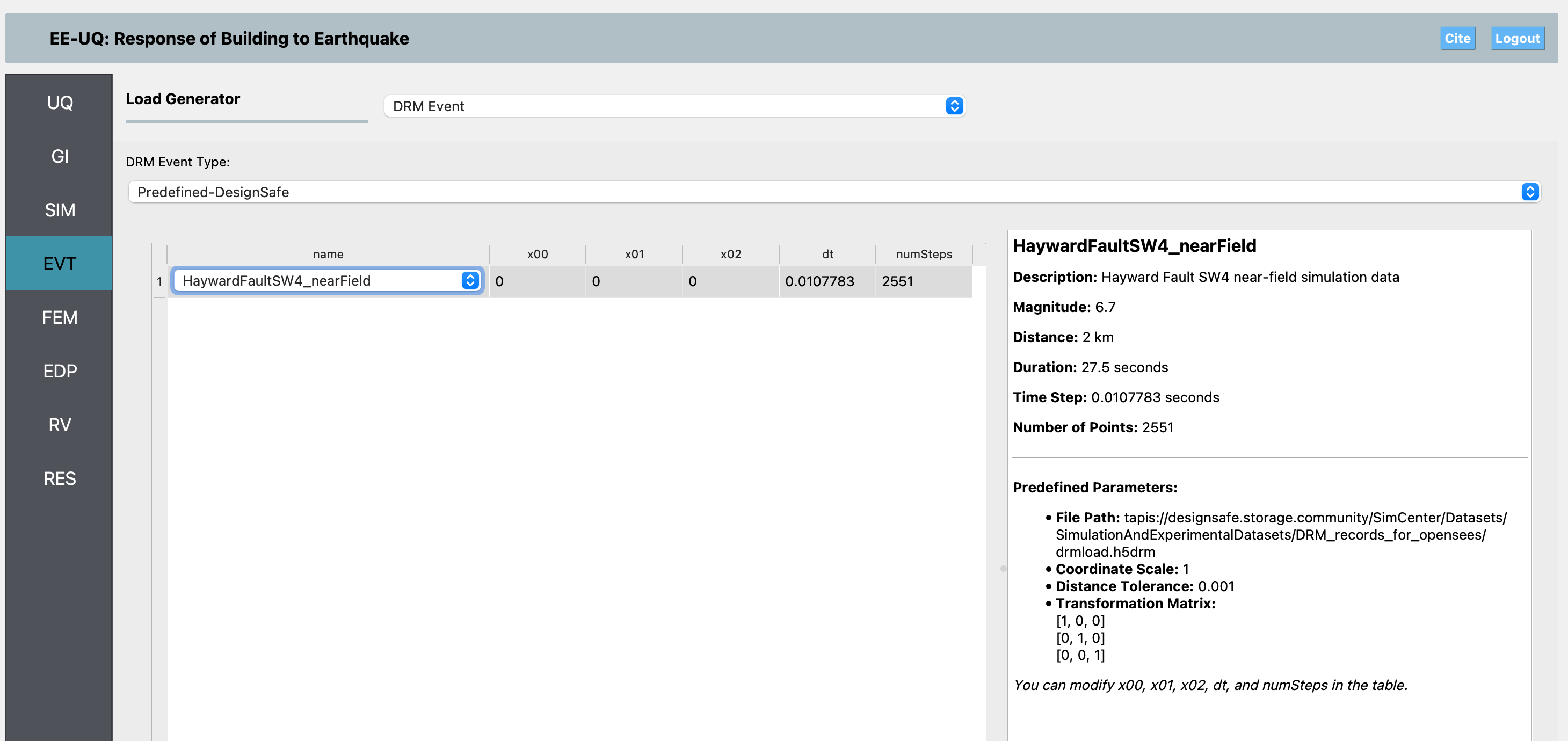 The idea behind predefined DRM files is that these H5DRM files are very large, so selecting them from your local computer is often not practical. Therefore, several predefined DRM loads are available on DesignSafe for you to use directly. If you choose a local DRM file (which is often the case for very large simulations), and you are running your case on a remote machine, EE-UQ will upload your file to DesignSafe, which may take significant time due to the file size. For local DRM files, you must specify the parameters for your H5DRM file yourself. For predefined DRM files, most of the parameters are already defined; you just need to choose the center of your model, as well as dt and numSteps. If you set dt and numSteps to -1, EE-UQ will automatically determine these values for you.