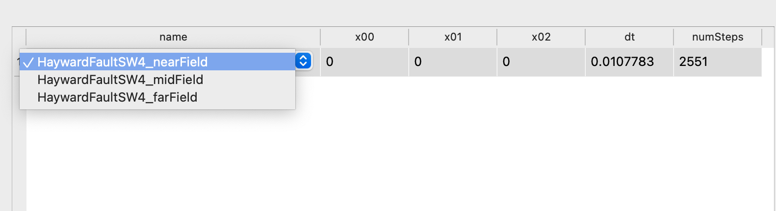For this example, we choose the HaywardFaultSW4_nearField predefined DRM file. In both the local and predefined DRM panels, there is a viewer next to the table of DRM events that provides information about the predefined DRM or the parameters you need to define the DRM event in the local case.