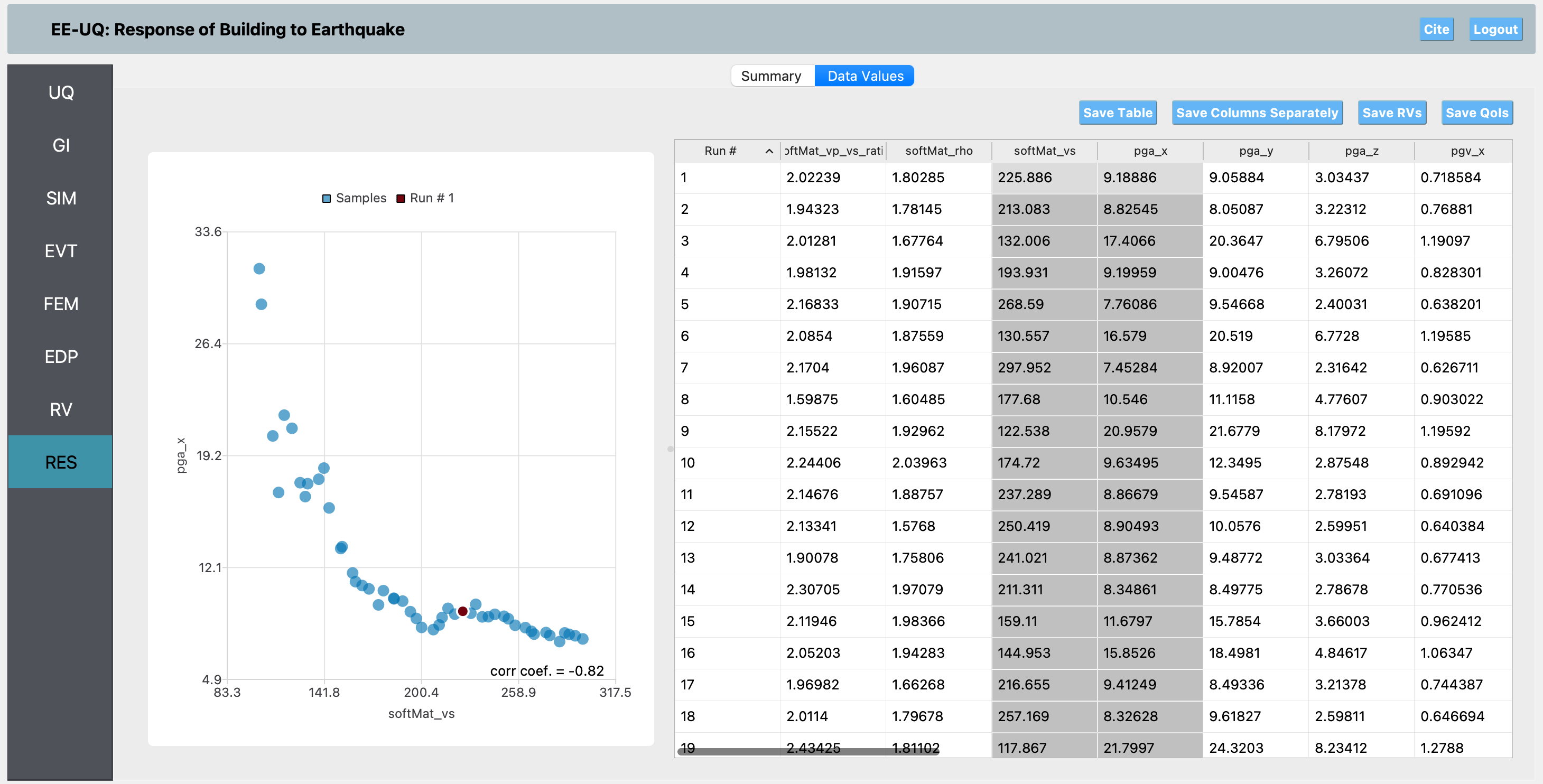 RES Panel: After completing the job, press Get from DesignSafe in the RES panel to retrieve your submitted job and results. You can then analyze and plot the results, such as plotting softMat_vs versus EDPs like PGA, CAV, and Arias intensity. These plots will show that decreasing the shear wave velocity (vs) leads to a drastic increase in these EDPs. However, it is important to note that while we expect to see amplification with decreasing vs, in reality, as vs decreases, the soil would behave more plastically and exhibit significant damping. Therefore, the level of amplification observed here is unrealistically high and mainly occurs at the initial steps of loading. This example still demonstrates the correct physical trend, as we use an elastic material model for the basin in this study.