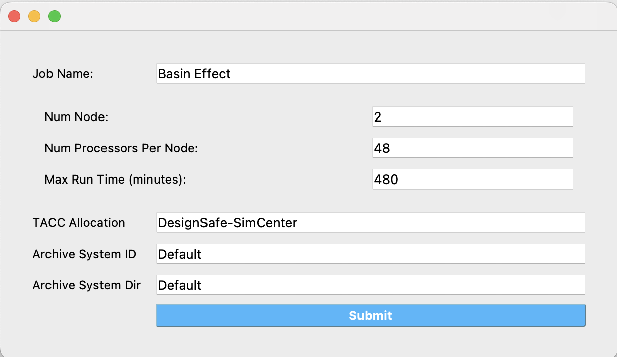Submit Panel: After setting up your random variables, go to the Submit panel. Here, you should select Run at DesignSafe. After logging in to your DesignSafe account, choose the following job configuration: 2 nodes and 48 cores per node for 480 minutes (8 hours). This configuration is recommended to ensure sufficient resources for the parallel OpenSees simulations in this example.