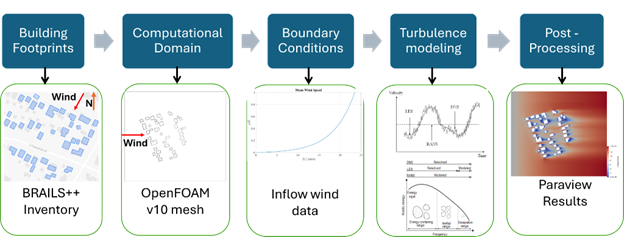 This example illustrates an advanced application of the CFD workflow. It demonstrates application of the workflow to any urban area by generating building footprints, creating computational meshes with refined regions, and setting realistic wind conditions to run a full-scale CFD simulation. It shows how users can define regions of interest, automate geometry and mesh generation, and post-process results to evaluate wind profiles and velocity fields, providing a practical template for applying the WE-UQ and BRAILS++ workflow to real community-scale wind studies.