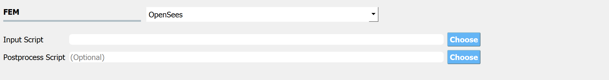 When the choice of FEM application is OpenSees (the default application), the user is presented with the input panel shown in the figure above and there are two entry fields for filenames: